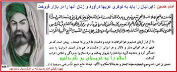 نظرتان درباره ی این سخن حسین چیست ؟ ما از تبار قریش هستیم و هواخواهان ما عرب و دشمنان ما ایرانی ها هستند. روشن است که هر عربی از هر ایرانی بهتر و هر ایرانی از دشمنان ما هم بدتر است. ایرانی ها را باید دستگیر کرد و به مدینه آورد و زنانشان را به فروش رساند و مردانشان را به بردگی و غلامی اعراب گماشت. امام سوم شیعیان / کتاب «سفینه البحار و مدینه الحکام و الآثار» صفحه ۱۶۴ نوشته شیخ عباس قمی